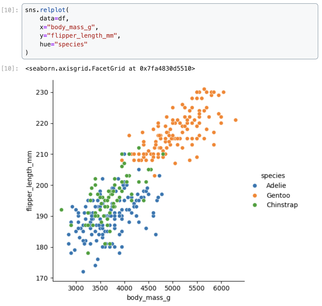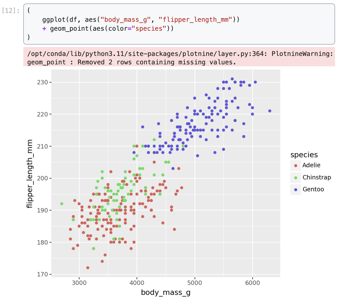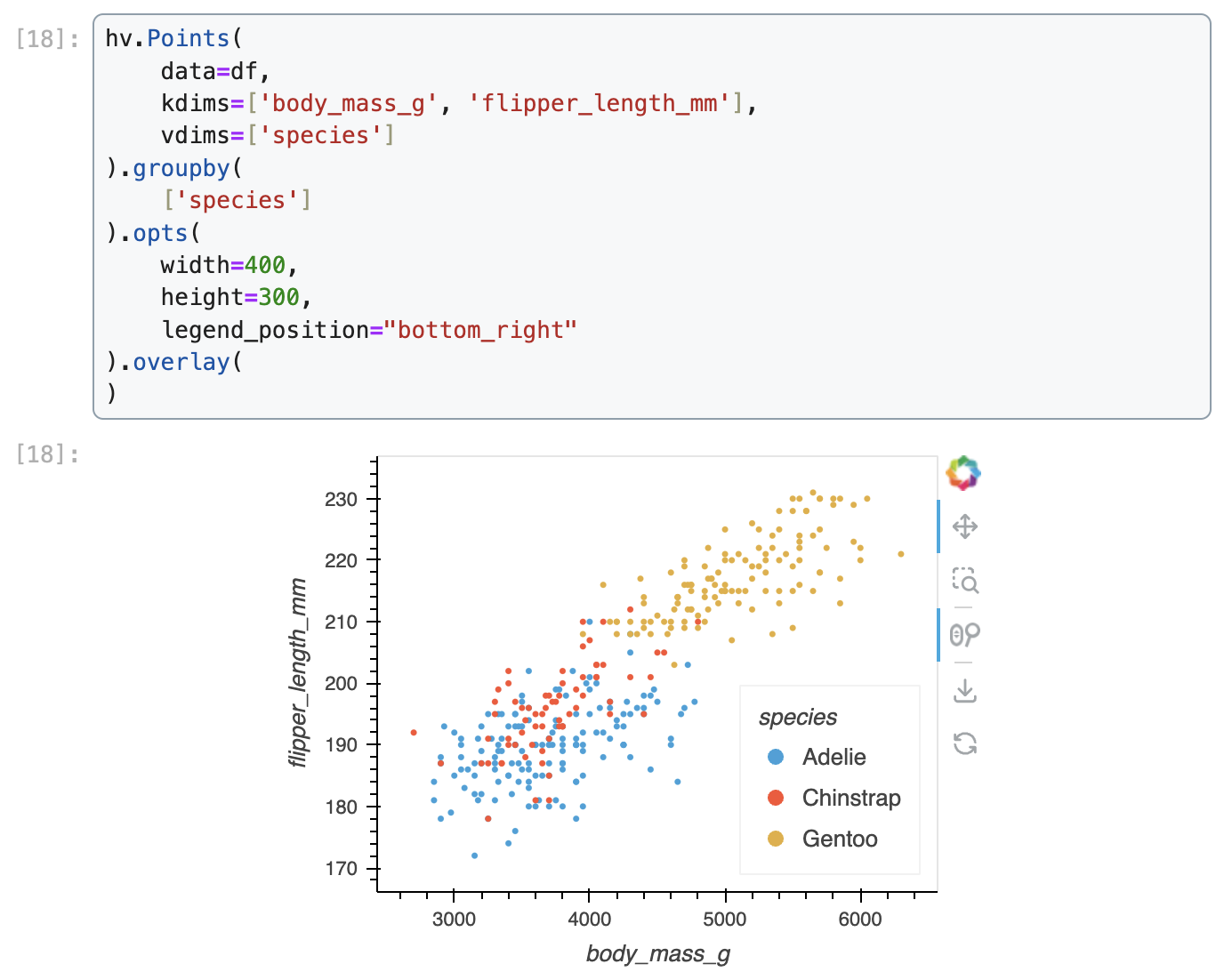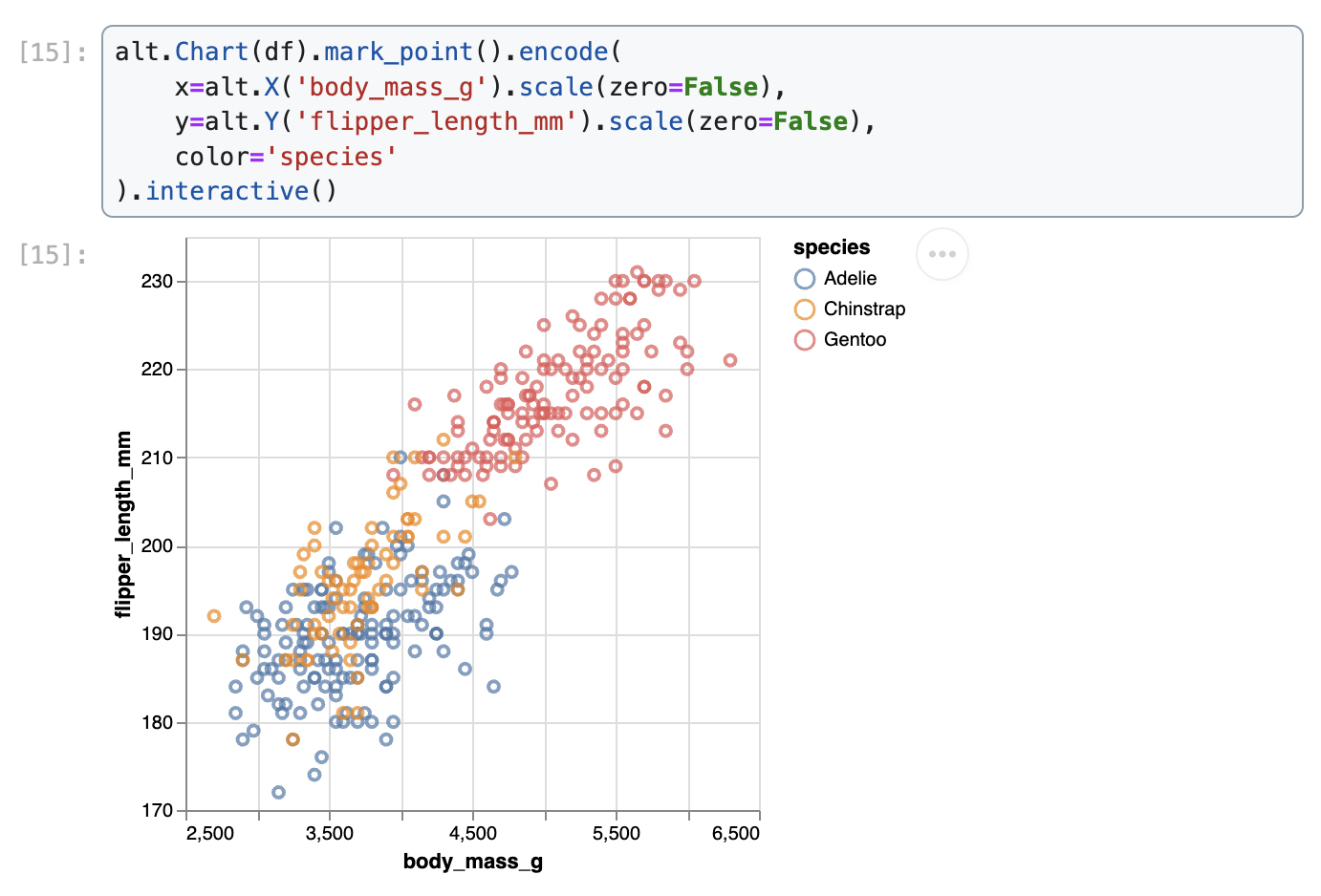 Data were collected and made available by Dr. Kristen Gorman and the Palmer Station, Antarctica LTER, a member of the Long Term Ecological Research Network.We demonstrate how to create a scatter plot of flipper length vs. body mass, colored by penguin species, in Matplotlib, Seaborn, Plotnine, Vega-Altair, and Holoviews.